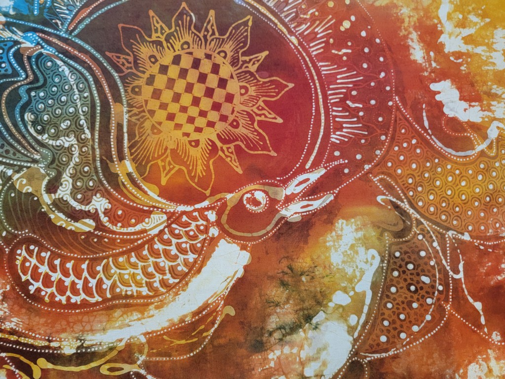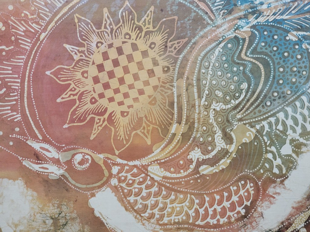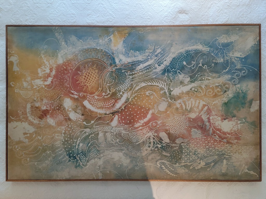 This Batik was purchased in Bali Indonesia in 2006. It is large 5′ x 3′ approximately. It has significantly faded over time and is very fragile. I have included pictures of the reverse side to show the initial vibrancy of the piece. I need to get this reframed and display the reverse side. Pablo Gentile generously had this framed for me and shipped back to California with his artwork.