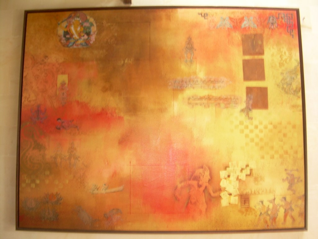 This first piece of art (a diptych) I think was called Buddha Clouds or perhaps that was the name I gave it. They are mixed media, oil, paper and gold foil and large, roughly 3′ x 5′. In addition there are a couple of vintage photos of these on display in Venice Beach California, and finally some larger pictures of the individual panels.